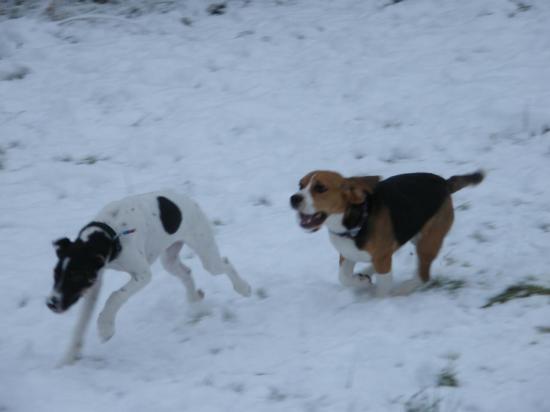 31/03/2011:o la la nuit court, Eclat est en debut de travail du coup elle pleurait, voulait aller creuser son trou dehors du. Ce matin coup notre jardin ressemble a hiroshima, un trou ici, un trou la et puis la bas .Ce matin elle est halletante, tremble, pleure, me colle non stop, bon , peut être se seront des chiots en mars. ( 37, 15°C)